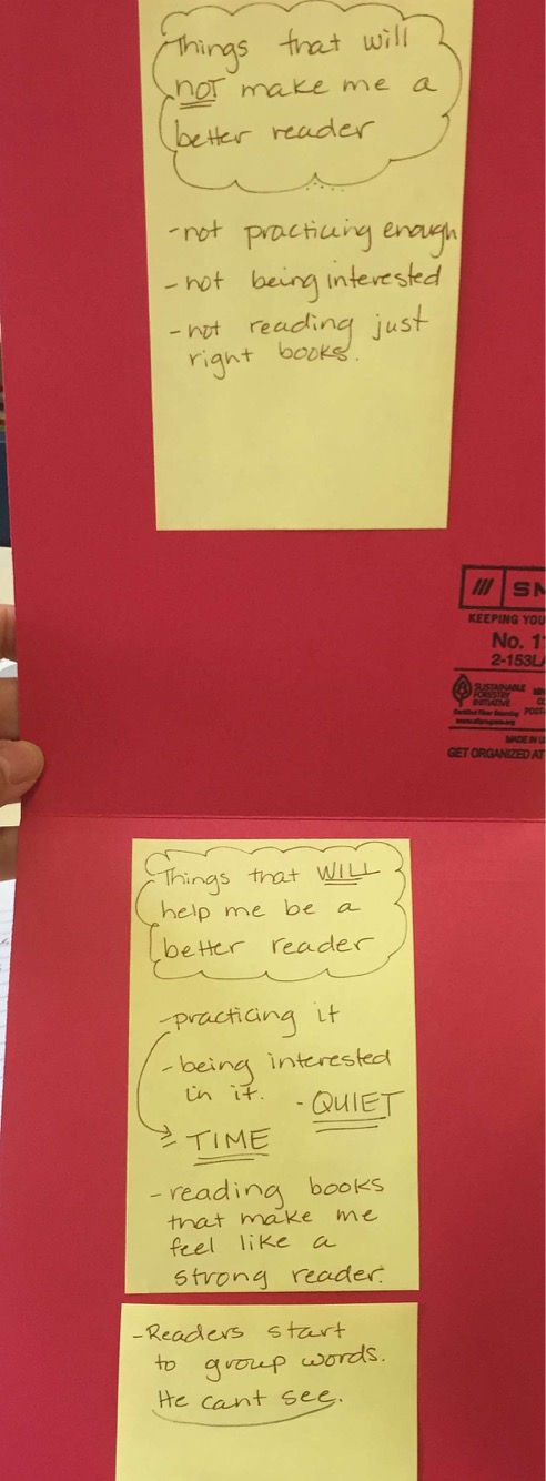 Another example of a quick observation that led to a subtle but powerful change comes from an intervention classroom in a public school in NYC. Nick, a striving 3rd grade reader, burst into the room and declared, “Let’s make lists about what helps you become a better reader and what doesn’t!” The teacher had a choice. Choosing to embrace the small moment, she set aside her lesson plans and let Nick lead the way. Nick started his list that will continue to grow as he grows as a reader. He spent the next 20 minutes avidly reading his book. The information that Nick wanted to know wouldn’t have come out in a running record or a standardized test. It came from listening to the small moment.